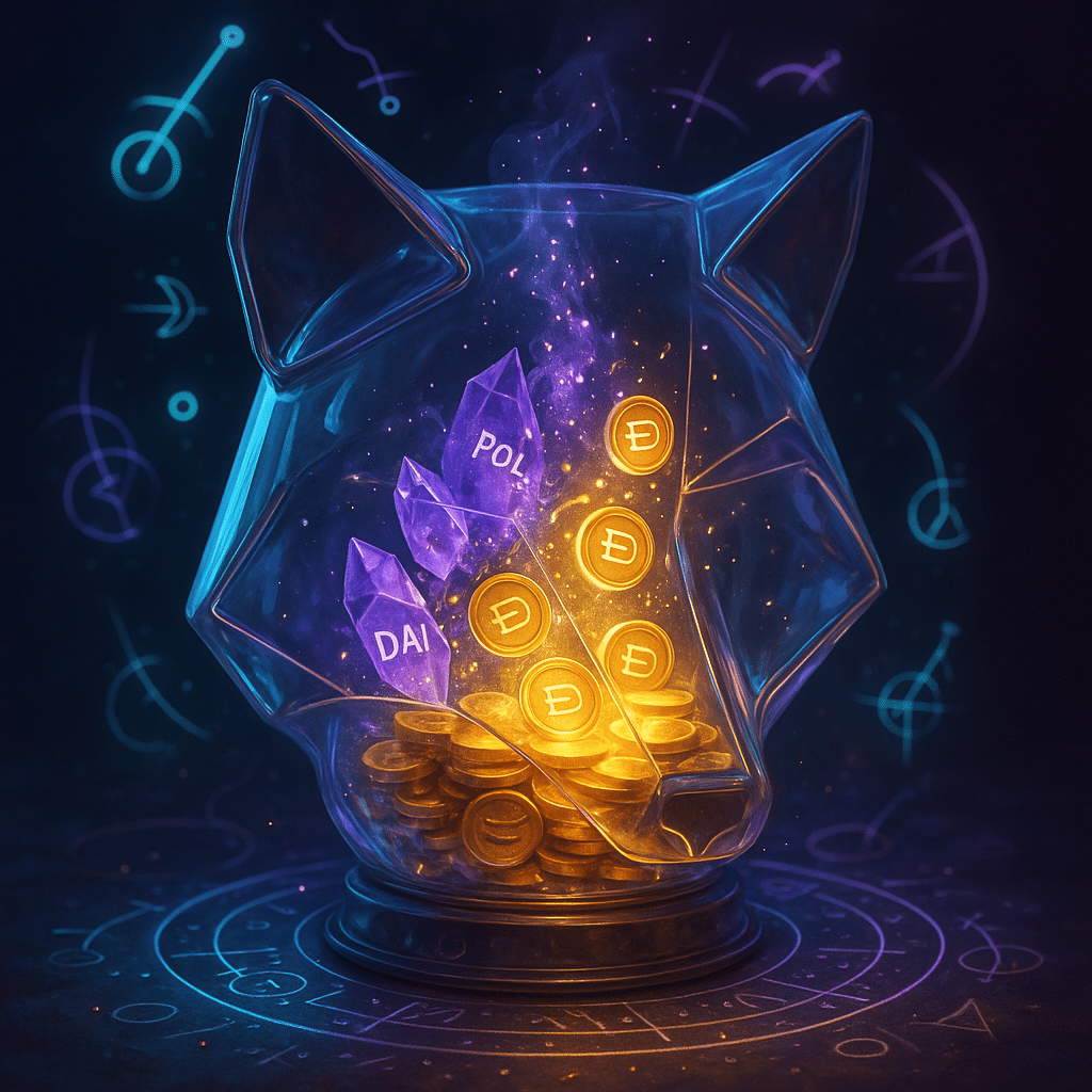 Внутри стеклянной колбы в виде головы лисы MetaMask фиолетовые кристаллы Polygon (MATIC) растворяются и превращаются в светящиеся золотые монеты DAI. Вокруг мягкое неоновое свечение и элементы цифровой алхимии. кинематографический свет, высокая детализация, фэнтези --ar 16:9 --v 6.0