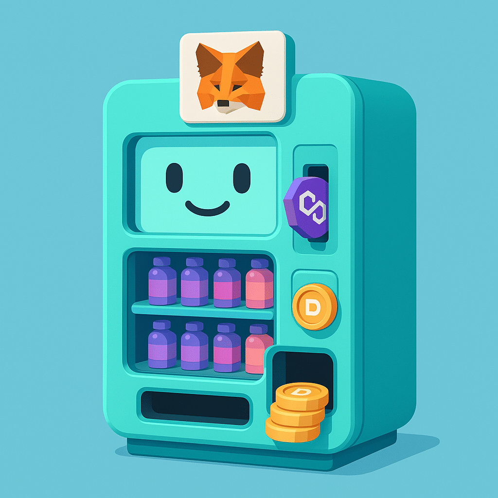 Дружелюбный футуристический торговый автомат с логотипом лисы MetaMask. В слот для монет вставляется фиолетовый многоугольный жетон Polygon. Из отсека для выдачи выпадает аккуратная стопка цифровых монет DAI. чистый дизайн, яркие цвета, иллюстрация в стиле flat 3D, игривый