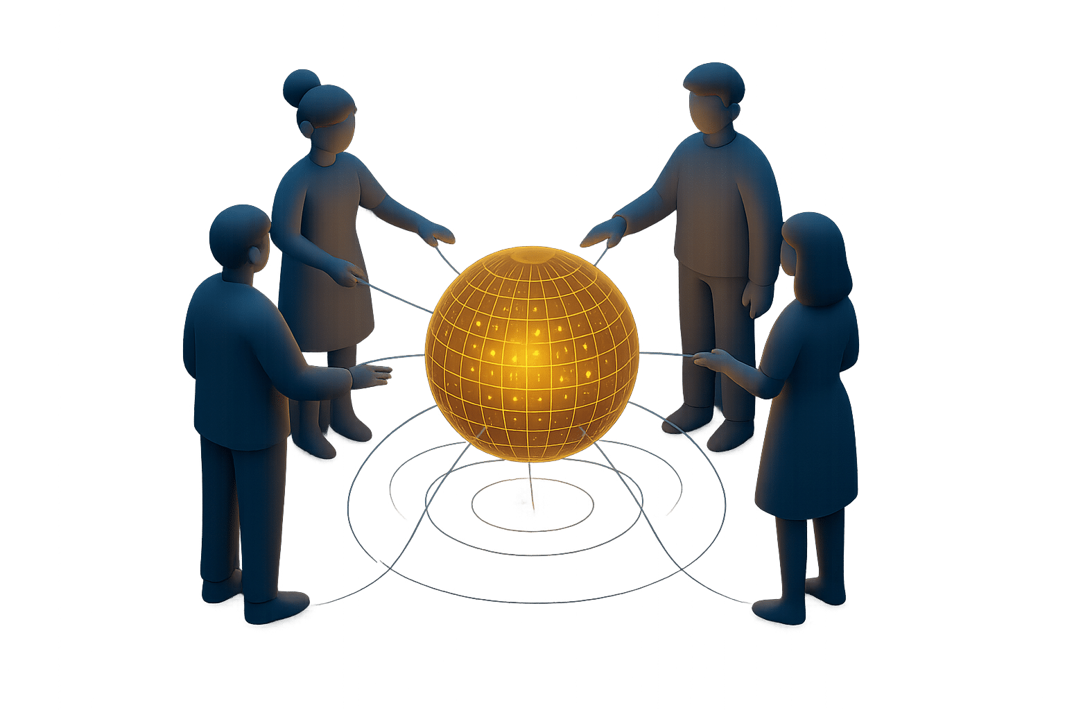 графический элемент в 3D без текста на прозрачном фоне, который визуализирует следующий текст: "группа людей стоит в кругу и вместе управляет светящимся цифровым ядром в центре, символизирующим компанию, от ядра к каждому человеку идут прозрачные энергетические нити, показывая их связь и право голоса, минимализм, футуристический дизайн, синие и золотые цвета, концепт-арт"
