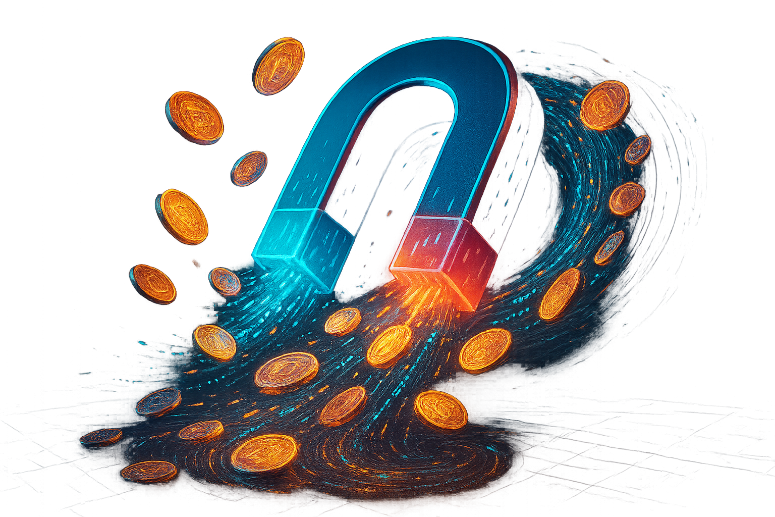 Этот промт визуализирует основную метафору проекта — магнит, притягивающий цифровые активы и создающий финансовый поток.