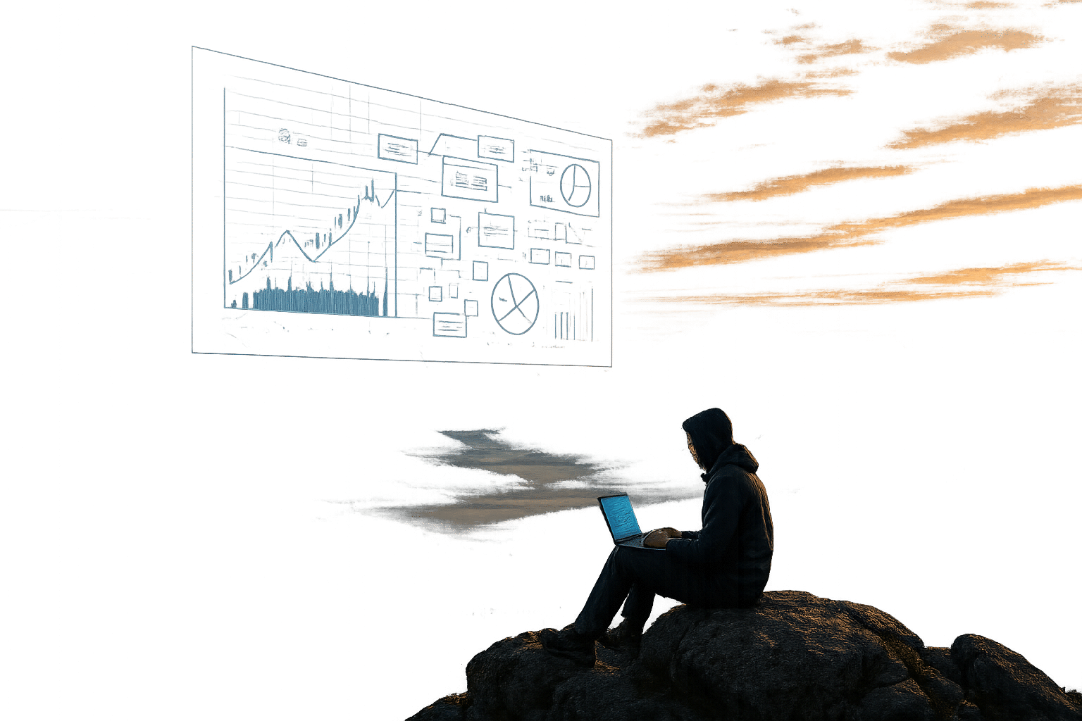 графический элемент в 3D без текста на прозрачном фоне, который визуализирует следующий текст: "человек в одиночестве сидит на вершине горы с ноутбуком, над ним в воздухе висит сложная голографическая схема финансового проекта, на фоне величественные горы Алтая на рассвете, туман в долинах, фотореализм, кинематографическое освещение, широкий угол, эпично"