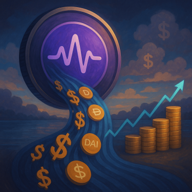 Промт для визуализации "Pulsecoin и Пассивный Доход": Крупный план футуристического токена Pulsecoin. Из токена исходит поток стабильных активов или символов $ и DAI, плавно переходящих в растущий финансовый график или стопку монет. На заднем плане - спокойная, надежная среда, символизирующая пассивный доход (например, цифровое озеро или облака с символами денег). Визуализация крипто дивидендов и стабильного заработка от владения Pulsecoin в экосистеме Magnet. Стиль: цифровая живопись, спокойные, но богатые цвета, ощущение надежности и роста.