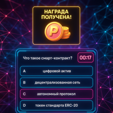 Промт для визуализации "Геймификация и Web3 Обучение": Интерфейс интерактивной игры-викторины на экране: виден вопрос по Web3 или блокчейну, таймер обратного отсчета и кнопки с вариантами ответов. Рядом или поверх интерфейса всплывает яркое уведомление "Награда получена!" с изображением токенов Pulsecoin. Фон - абстрактная, динамичная Web3 сеть из светящихся линий и узлов. Визуализация геймифицированного процесса обучения и мгновенных наград в Magnet Learn To Earn. Стиль: киберпанк или футуристический UI (User Interface), неоновые акценты, ощущение скорости и интерактивности