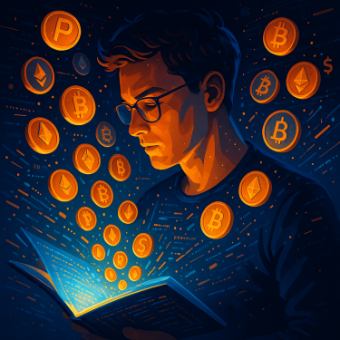 Промт для визуализации "Учись и Зарабатывай" (L2E): Визуализация концепции Learn To Earn. Человек сосредоточенно изучает светящийся экран или книгу с цифровыми символами. Из его головы или из экрана вылетают золотые монеты (токены Pulsecoin) и символы криптовалют (ETH, BTC, $). Вокруг летают цифровые данные, линии кода и абстрактные элементы блокчейна. Стиль: современное цифровое искусство, ощущение потока, преобразования знаний в богатство, яркие акценты.