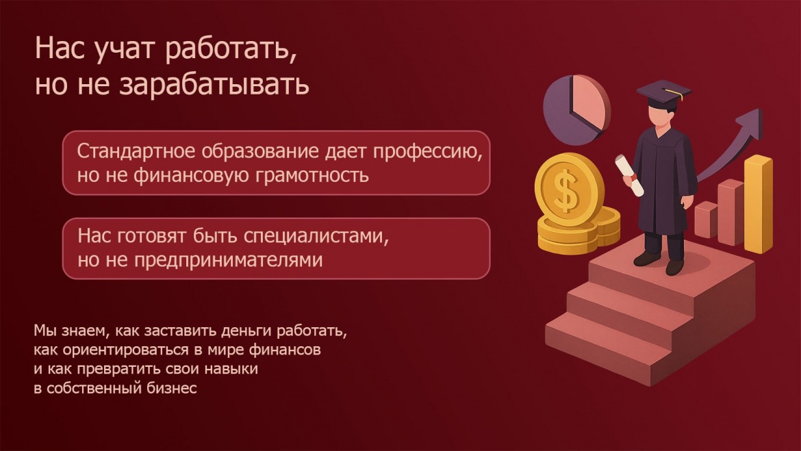 Но знаем ли мы, как создать капитал? Наше образование дает нам профессию, но оставляет огромный пробел там, где начинается финансовая грамотность. Нас готовят быть первоклассными специалистами, но не предпринимателями. Нас учат быть частью системы, а не создавать свою собственную.