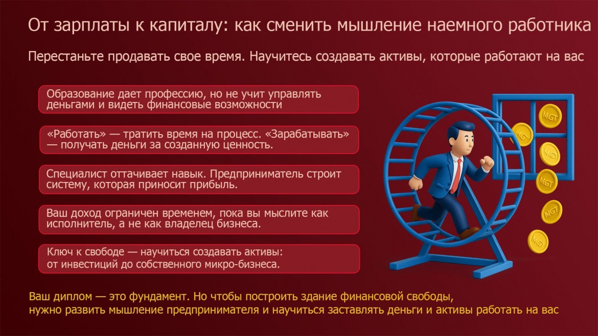 Ваш диплом — это фундамент. Но чтобы построить здание финансовой свободы, нужно развить мышление предпринимателя и научиться заставлять деньги и активы работать на вас.