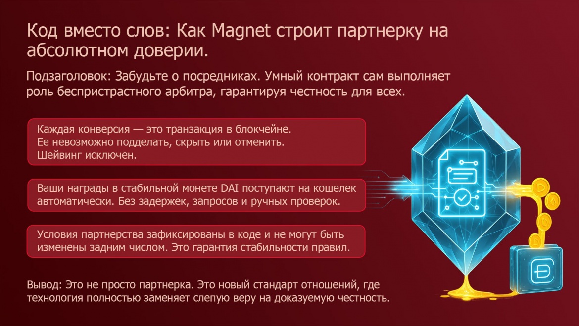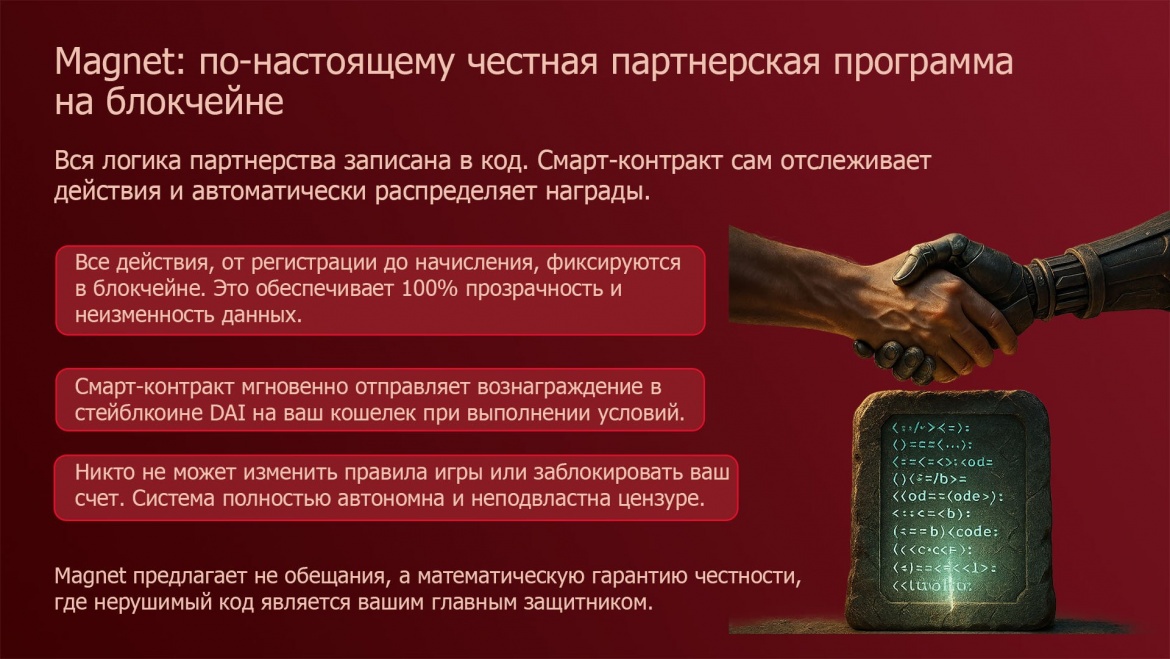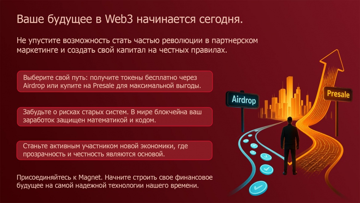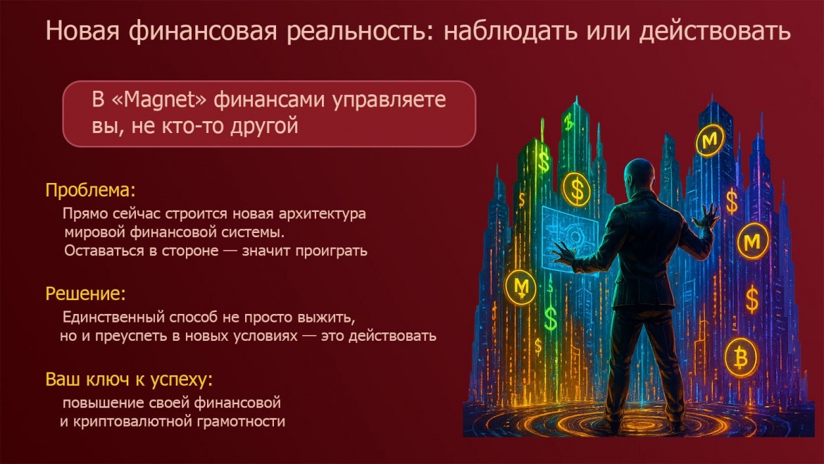 Поэтому мой призыв прост и логичен: Присоединяйтесь к Magnet. Начните строить свое финансовое будущее на технологии, которая заменяет доверие на стопроцентную гарантию».