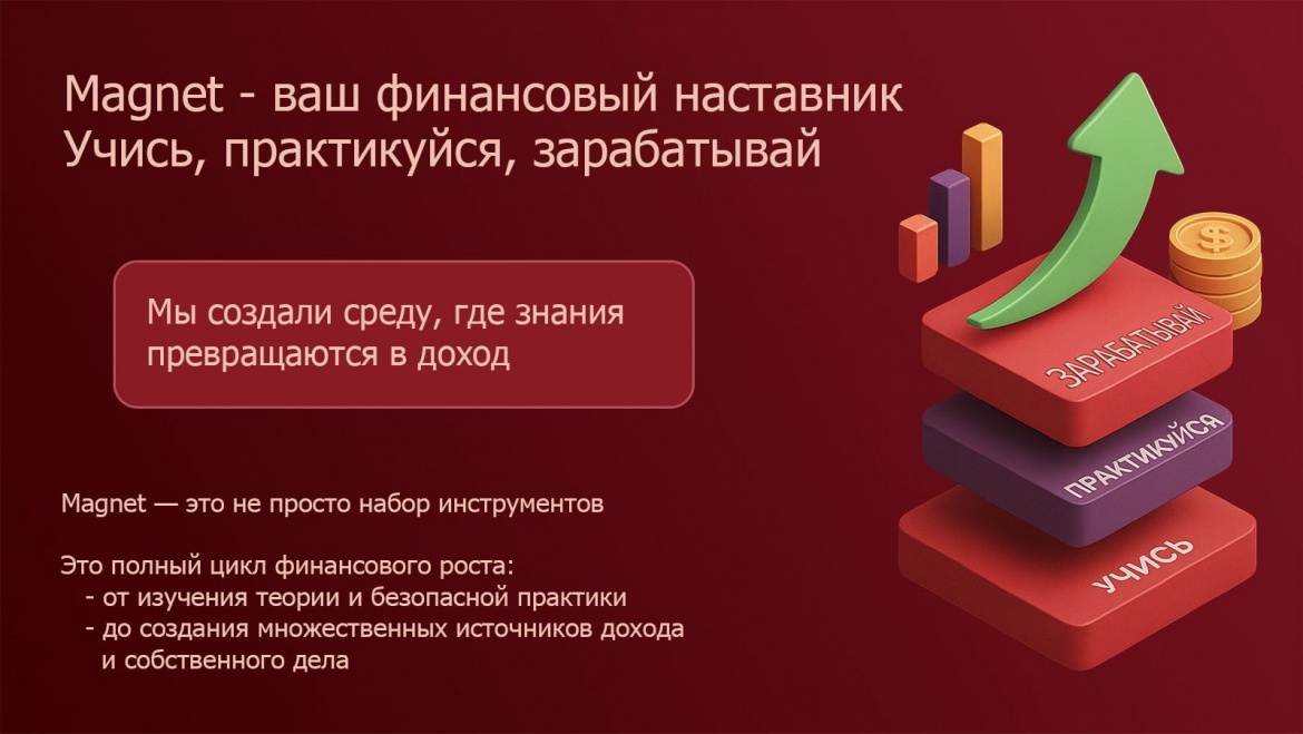 Посмотрите на этот слайд. Magnet – это не просто название. Для нашей команды это целая философия. Мы создали платформу, которая не просто дает информацию, а действительно учит зарабатывать.