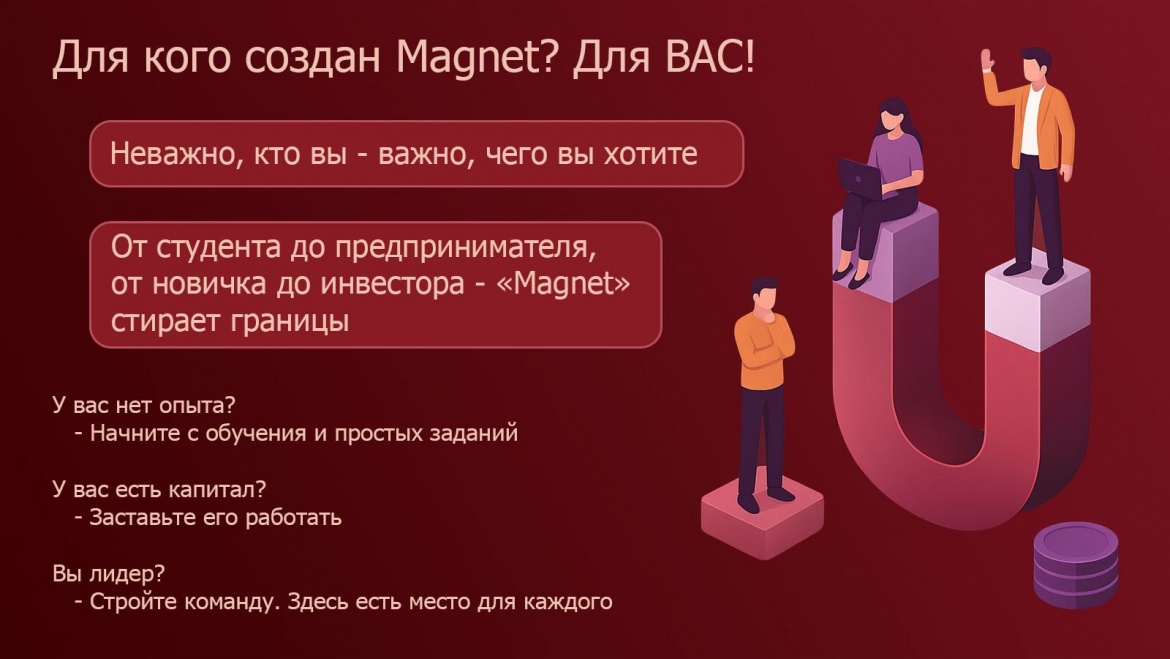 Знаете, мы назвали наш проект Magnet, потому что верим, что каждый может научиться "притягивать" возможности и деньги. Наша платформа создана именно для этого – она учит зарабатывать.