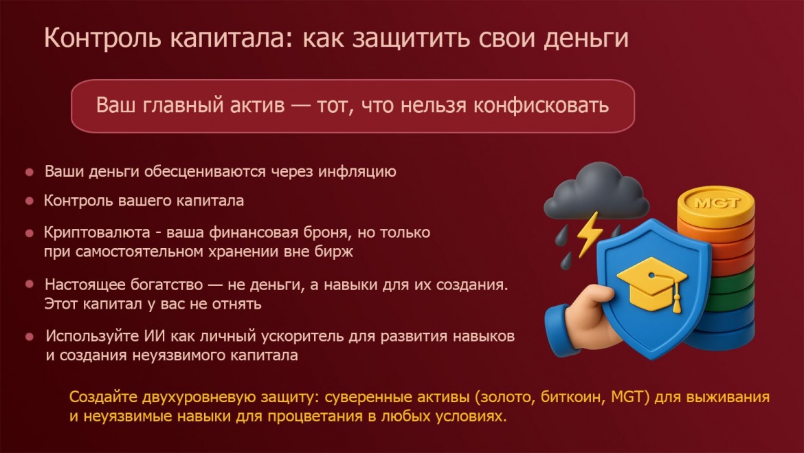 Создайте двухуровневую защиту: суверенные активы (золото, биткоин, MGT) для выживания и неуязвимые навыки для процветания в любых условиях.