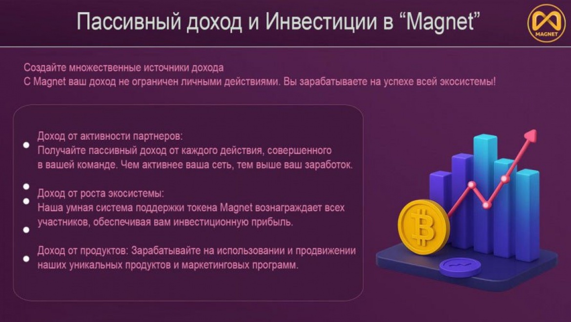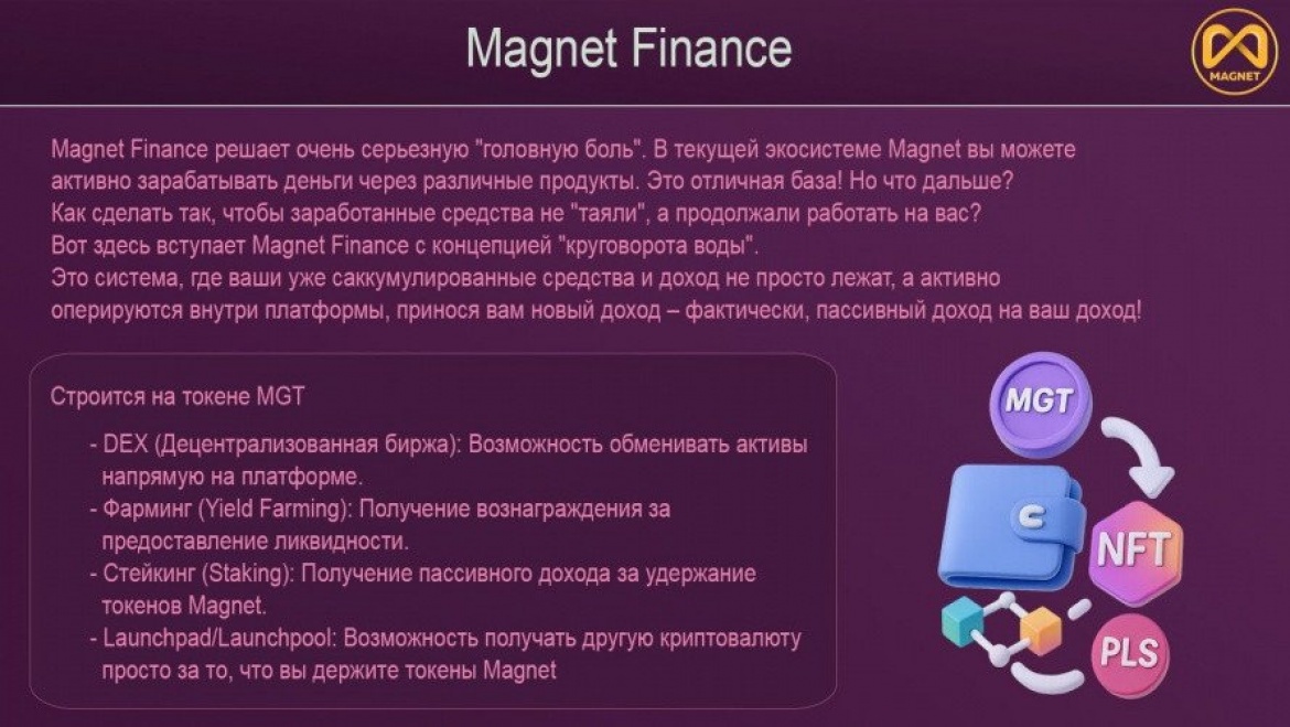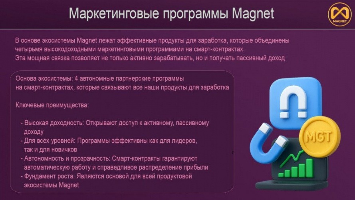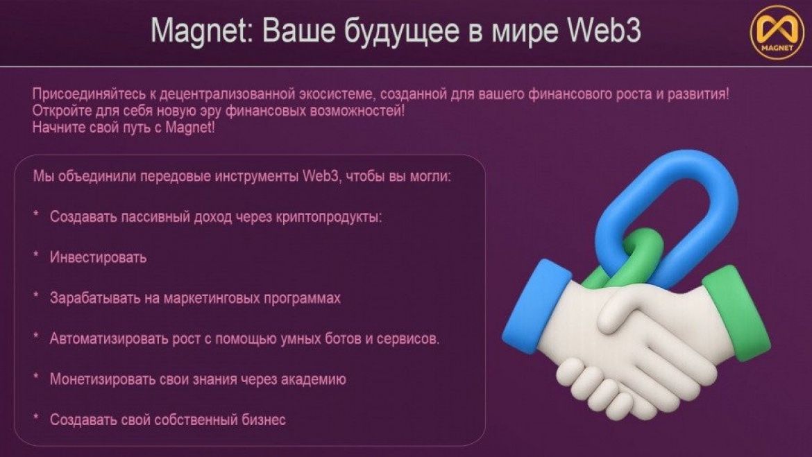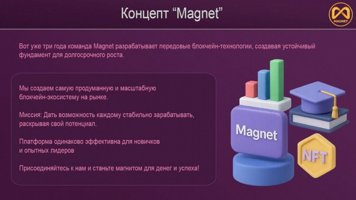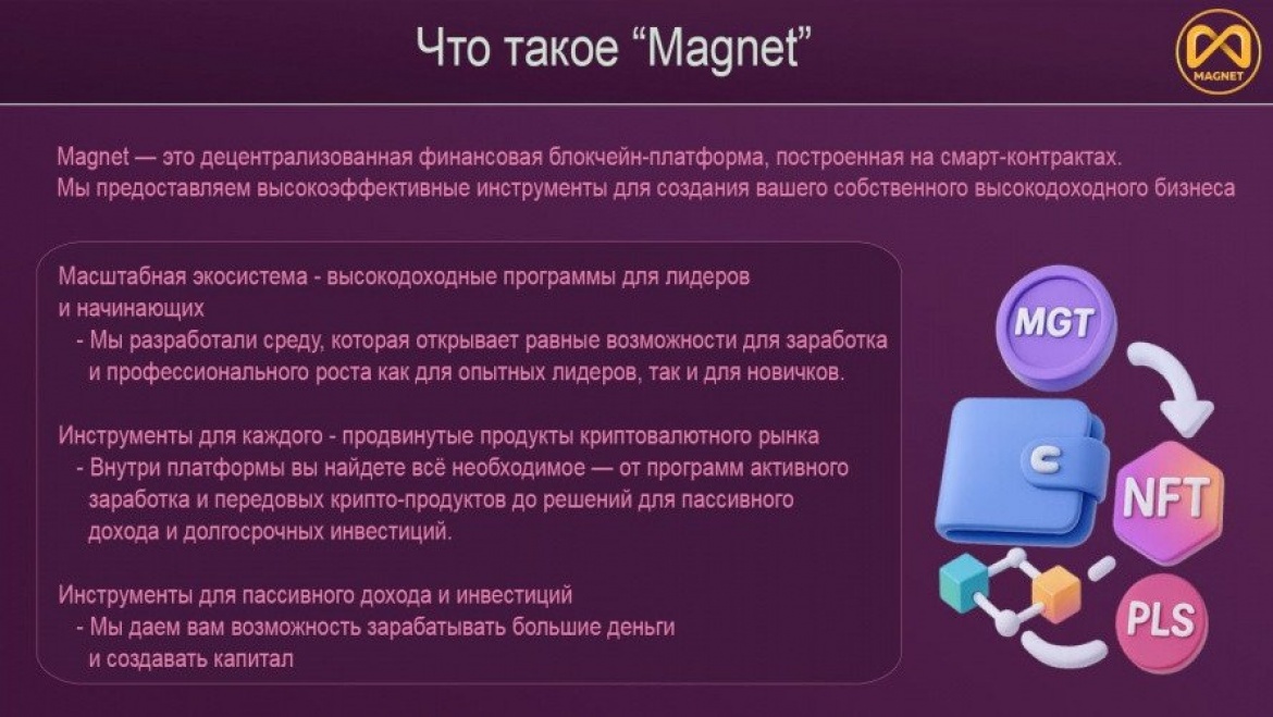 Magnet — это децентрализованная финансовая блокчейн-платформа, построенная на смарт-контрактах. Мы предоставляем высокоэффективные инструменты для создания вашего собственного высокодоходного бизнеса.