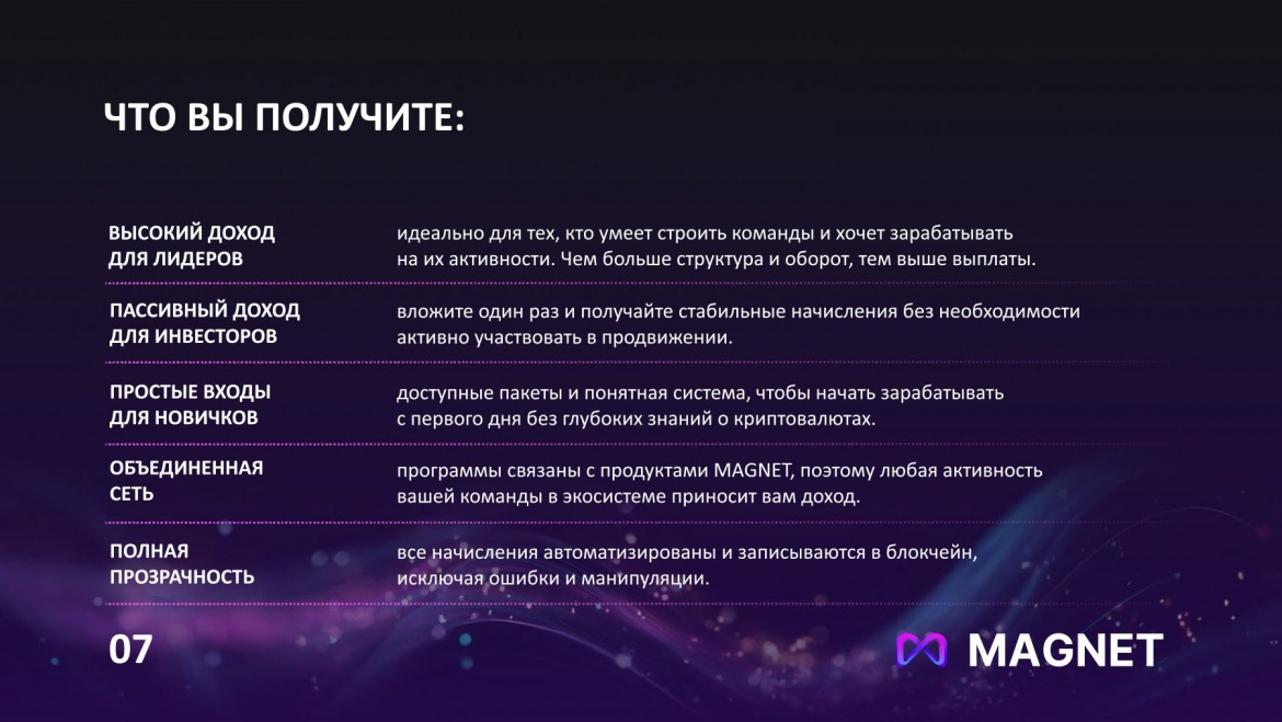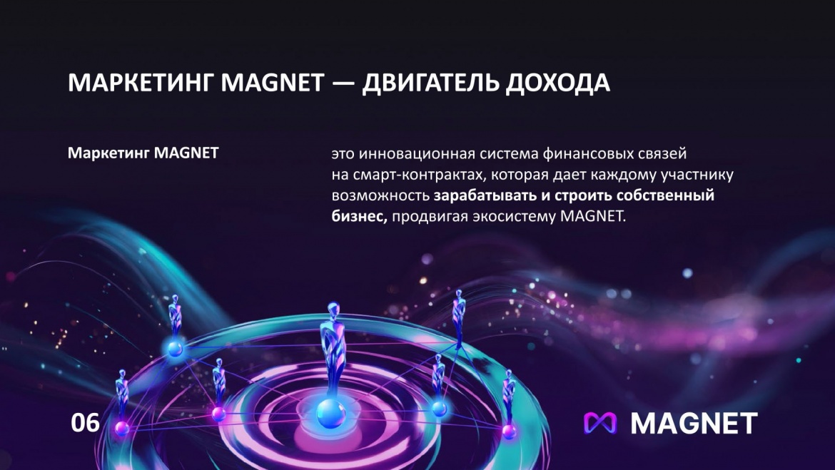 это инновационная система финансовых связей на смарт-контрактах, которая дает каждому участнику возможность зарабатывать и строить собственный бизнес, продвигая экосистему MAGNET.